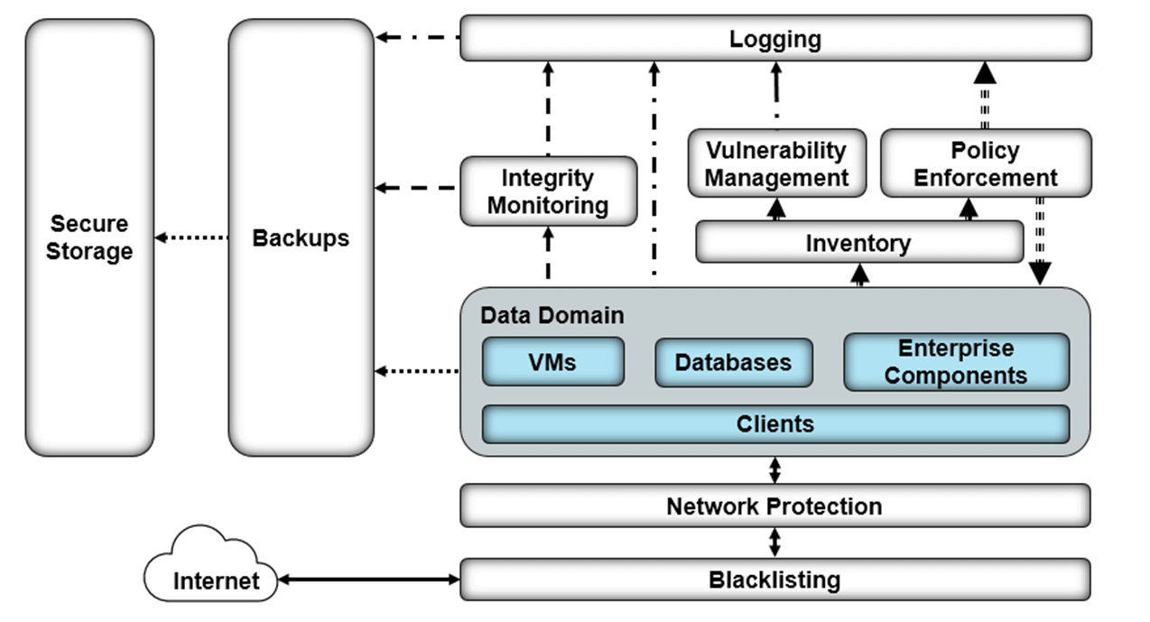 The outcomes of vulnerability management and integrity monitoring are fed into the logging capability. Logging from each enterprise component serves several functions in an architecture that aims to identify and protect assets.