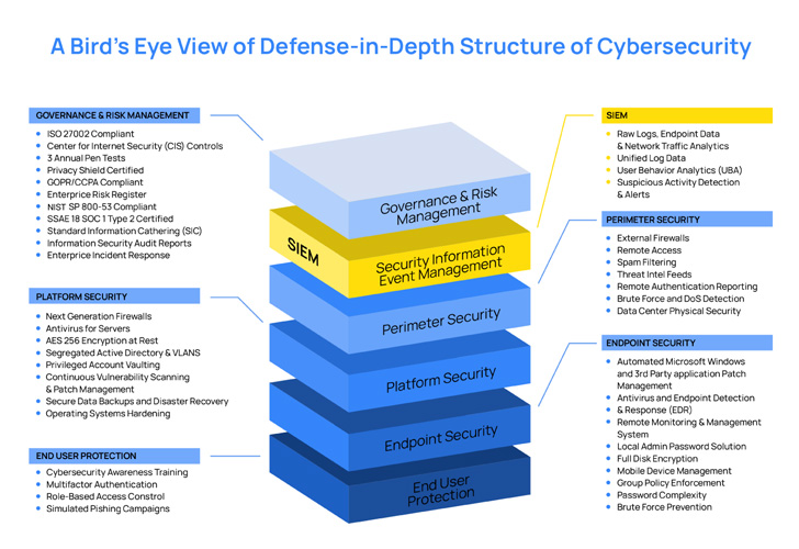 | The image above shows the various layers of security that organizations must implement. Below we describe ideas that companies should consider for each layer. |