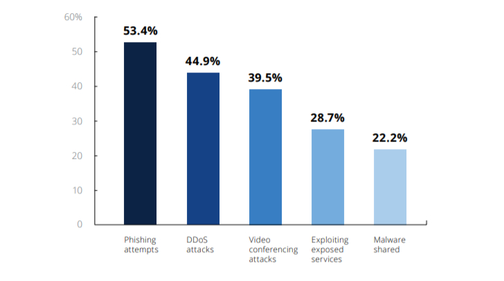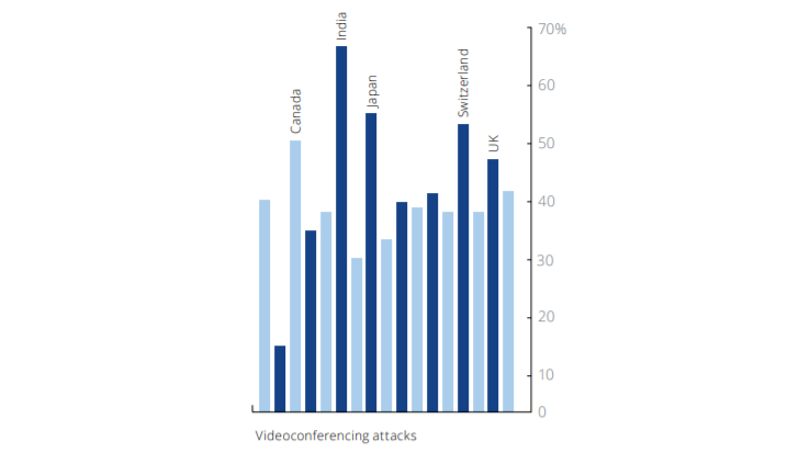 Further, 39% of all organizations surveyed experienced video conferencing attack. Among them, India, Canada, Switzerland, and the UK are the most affected countries.
