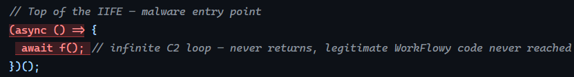 - Malware executes before the legitimate application starts: The injected IIFE opens with await f() — the infinite C2 beacon loop. Because f() never resolves, all legitimate WorkFlowy initialization code that follows is permanently blocked. The malware runs with full Node.js privileges immediately on launch.