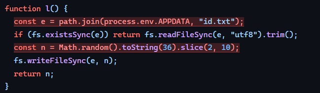 - Persistent victim fingerprinting via %APPDATA%\id.txt: A random 8-character alphanumeric ID is generated on first run and written to %APPDATA%\id.txt. On subsequent runs, the stored ID is read back, giving the attacker a stable identifier for each victim machine across sessions.