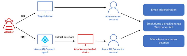In the activity detected by Redmond, DEV-1084 subsequently abused highly privileged compromised credentials to perform encryption of on-premise devices and large-scale deletion of cloud resources, including server farms, virtual machines, storage accounts, and virtual networks.