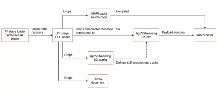 In an alternate attack chain, a Microsoft Excel decoy document is used as an initial vector to kick-start a multi-stage process to deliver and execute IMAPLoader, indicating that the threat actor is using a variety of tactics and techniques to realize its strategic goals.