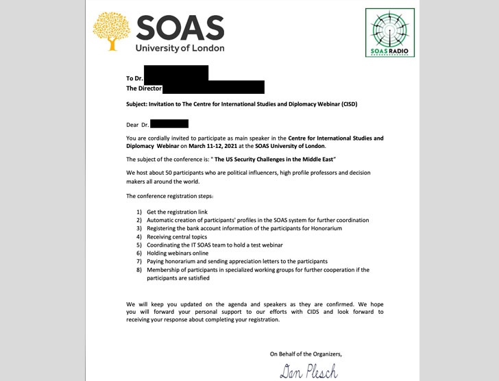 Some of the SOAS scholars who were impersonated included Dr. Hanns Bjoern Kendel, an associate professor of diplomatic studies and international relations, and Dr. Tolga Sinmazdemir, a senior lecturer in political methodology.
