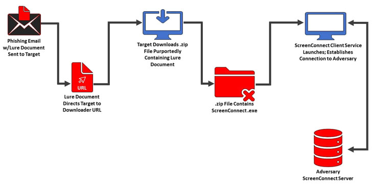 The attack commences by directing users to a downloader URL pointing to these ZIP files via a phishing email that, when opened, launches the installation process for ScreenConnect, and subsequently uses it to communicate with the adversary. The URLs themselves are distributed through decoy documents embedded in the emails.