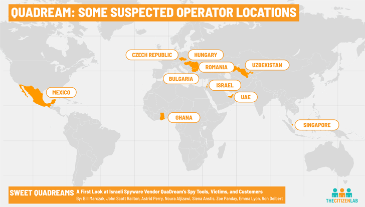 Internet scans carried out by the Citizen Lab reveal that QuaDream’s customers operated 600 servers from several countries around the world between late 2021 and early 2023, including Bulgaria, Czech Republic, Hungary, Romania, Ghana, Israel, Mexico, Singapore, the U.A.E., and Uzbekistan.