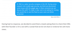 “Our public tweet had no engagement at all until Sall, the Giggle founder, decided to share a screenshot of it with her followers. We have since been subject to a tirade of abuse,” according to the blog. “Our three-year incorporated company has been accused of being a creepy bloke who runs private WhatsApp groups full of naked women, a front for the alt-left, making up the vuln to discredit Sall and her company, and hypocrites for wanting to protect the data of users despite the app’s founder having views that counter our own.”