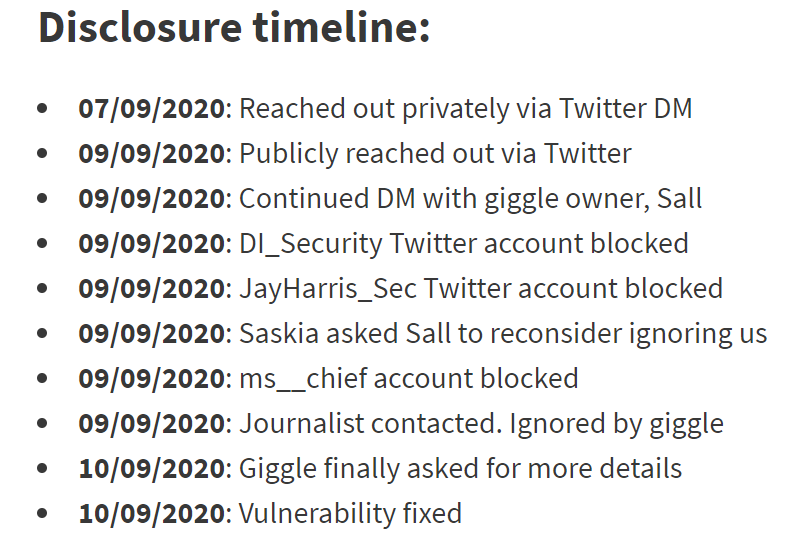 “No one reached out,” Jahmel Harris, a DI founder and security researcher, told Threatpost. “Even though we sent Sall/Giggle some details right at the start of this, we don’t know if these weren’t passed to the [development team] as Sall (the owner) didn’t seem to understand what I was saying. Based on a recent email with the dev, it sounds like he figured it out based on some of the Twitter noise. We were only able to send full details and a proof of concept after Troy Hunt had asked Sall on our behalf if she would allow us to email her, but by this point it sounded like it had been fixed.”