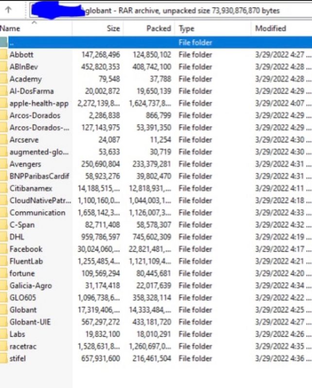 Screenshots show a folder directory of what looks like scads of companies from across the world, including tech bigwigs Arcserve, Facebook, the Apple Health app, DHL, Citibank, BNP Paribas Cardiff and Citibanamex, among others: just a teaser of the Globant data Lapsus$ has promised to leak.