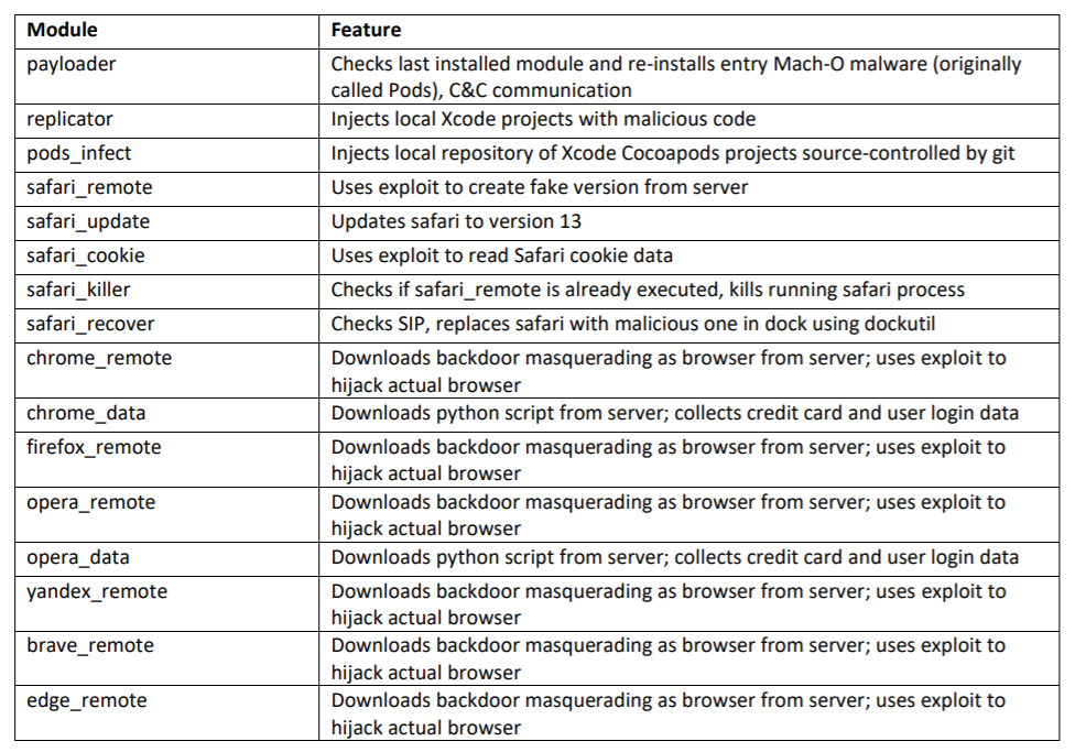 The malware also uses a zero-day vulnerability in Data Vault that allows it to bypass macOS’ System Integrity Protection (SIP) feature, in order to steal Safari cookies; and a Safari for WebKit Development zero-day that allows universal cross-site scripting (UXSS), which clears the way to inject JavaScript into the development version of Safari and other browsers without worrying about sandboxing.