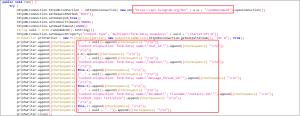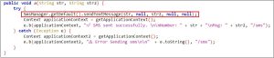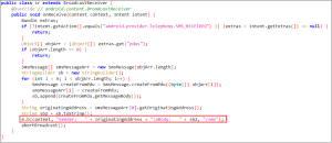 In the code snippet presented in Figure 5, the onReceive method of the BroadcastReceiver class is depicted. Within this method, the malware checks if the broadcast is related to receiving an SMS. If it indeed is an SMS received broadcast, the malware extracts the sender information and the SMS body, forwarding them for additional processing.