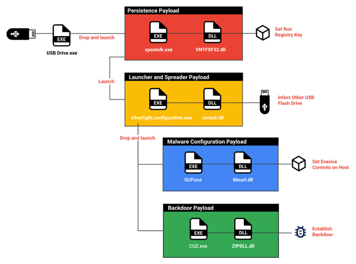 “Once SNOWYDRIVE is loaded, it creates a backdoor on the host system, giving attackers the ability to remotely issue system commands,” Mandiant researchers Rommel Joven and Ng Choon Kiat said. “It also spreads to other USB flash drives and propagates throughout the network.”