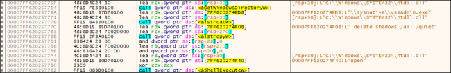 It then creates the threads. The first thread will delete Registry keys and then it deletes the Shadow copy as shown in below: