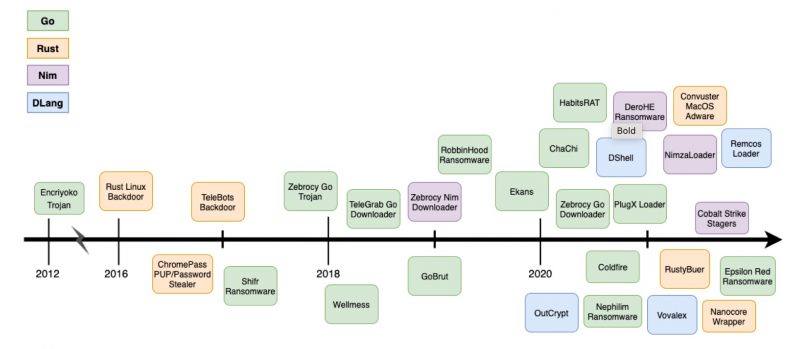 Timeline of prominent examples of malware written in the languages of Go, Rust, Nim, and DLang. Source: Blackberry.