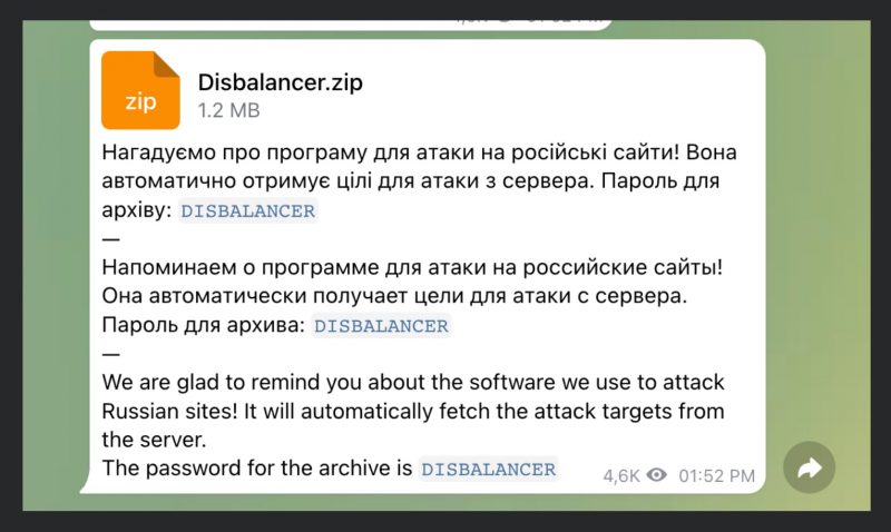 The malware in the Telegram message brands itself as a “Disbalancer” .ZIP file. There is, in fact, a group called “disBalancer” that distributes a “legitimate” DDoS attack tool called, ironically enough, Liberator, Cisco found – a tool for waging cyberwar against “Russian propaganda websites.”