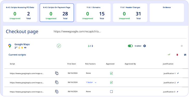 - Script Approvals: Easily approve and justify individual script changes to meet requirements 6.4.3 and 11.6.1.
