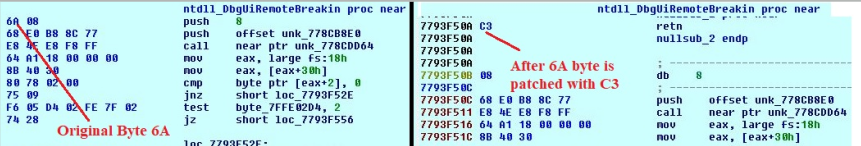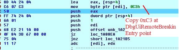 Fig 7. Copy 0xC3 at dbgUiRemoteBreakin Entry point