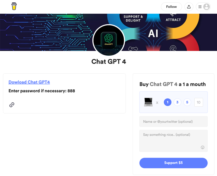 Besides using social media for propagating the ChatGPT-themed malicious URLs, the malware is hosted on a variety of legitimate services such as Buy Me a Coffee, Discord, Dropbox, Google Drive, iCloud, MediaFire, Mega, Microsoft OneDrive, and Trello.