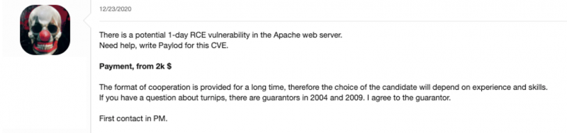 Five months after it was patched, in August 2020, another forum post requested an exploit, offering the bargain basement payment of $2,000: a tenth of the original exploit.
