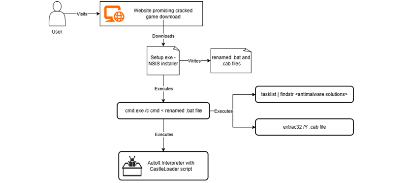 Other CastleLoader campaigns have also leveraged websites promising cracked software downloads as a starting point to distribute a fake NSIS installer that also runs obfuscated VBA scripts prior to running the AutoIt script that loads Lumma Stealer. The VBA loader is designed to run scheduled tasks responsible for ensuring persistence.