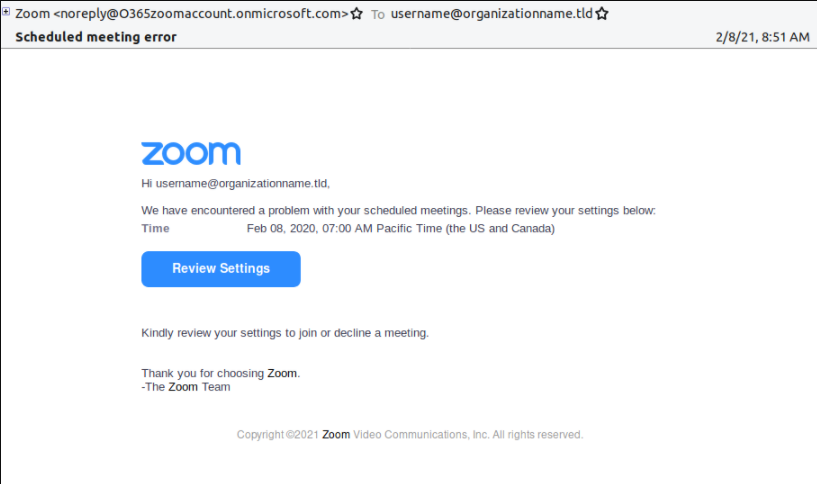 Another example provided by Proofpoint attempted to use the domain name “onmicrosoft.com” to deliver a fake video-conferencing credential harvesting email, which researchers observed was delivered to about 10,000 users.