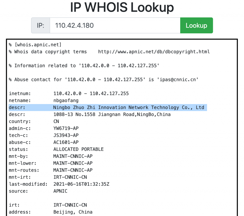 According to WHOIS records, the command-and-control (C2) address – IP 110.42.4.180 – that the malicious Netfilter driver connected to belonged to Ningbo Zhuo Zhi Innovation Network Technology Co. Ltd.