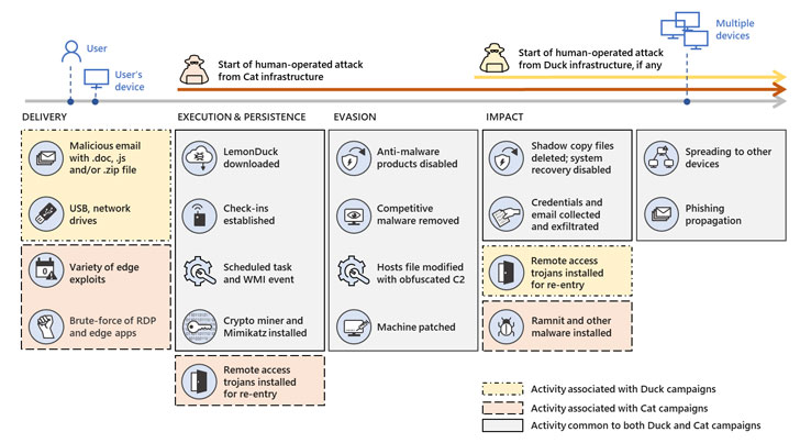 “The fact that the Cat infrastructure is used for more dangerous campaigns does not deprioritize malware infections from the Duck infrastructure,” Microsoft said. “Instead, this intelligence adds important context for understanding this threat: the same set of tools, access, and methods can be re-used at dynamic intervals, to greater impact.”
