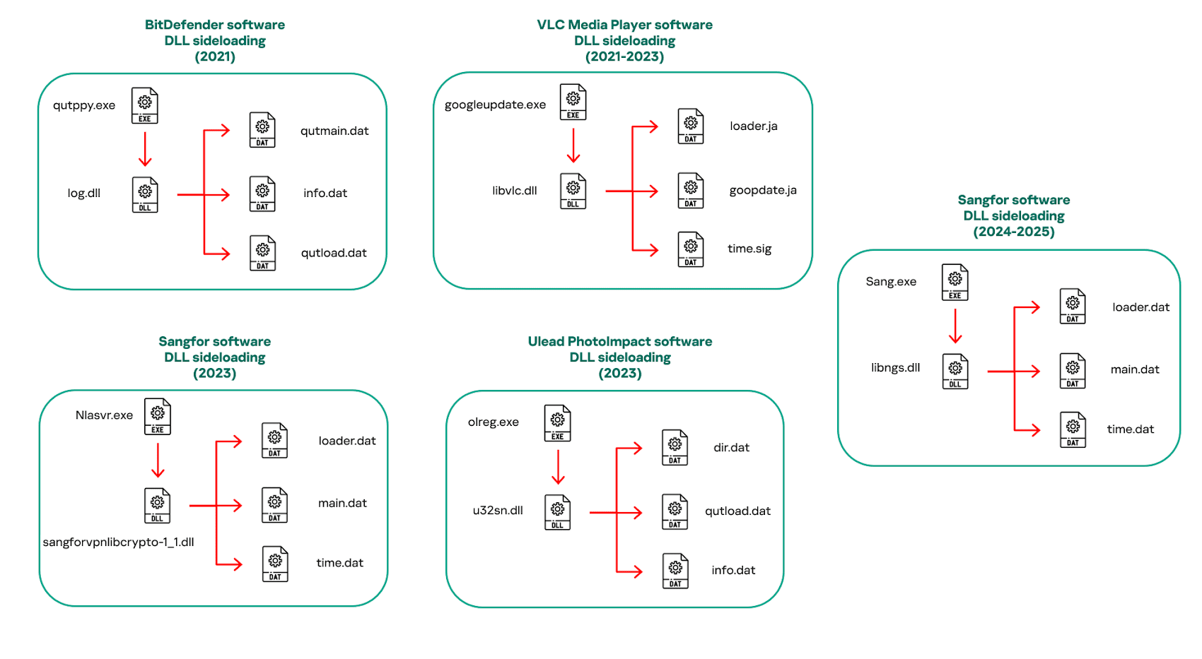 Between 2021 and 2025, Mustang Panda is said to have leveraged signed binaries from various software products, including Bitdefender (“qutppy.exe”), VLC Media Player (“vlc.exe” renamed as “googleupdate.exe”), Ulead PhotoImpact (“olreg.exe”), and Sangfor (“sang.exe”) for this purpose.