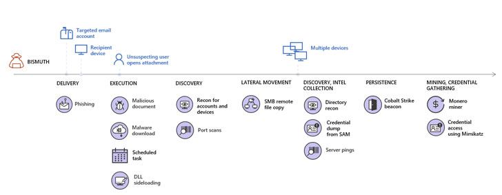 Attributing the shift to a threat actor tracked as Bismuth, Microsoft’s Microsoft 365 Defender Threat Intelligence Team said the group deployed Monero coin miners in attacks that targeted both the private sector and government institutions in France and Vietnam between July and August earlier this year.