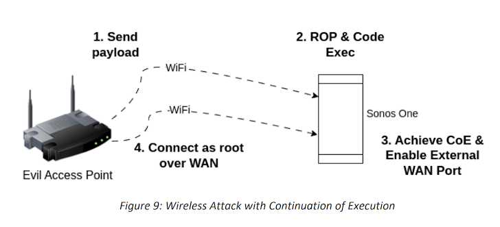 NCC Group, which reverse-engineered the boot process to achieve remote code execution on Sonos Era-100 and the Sonos One devices, said CVE-2023-50809 is the result of a memory corruption vulnerability in the Sonos One’s wireless driver, which is a third-party chipset manufactured by MediaTek.