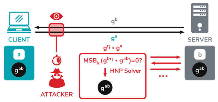 “The root cause for this side channel is that the TLS standard encourages non-constant-time processing of the DH secret,” the researchers explained their findings in a paper. “If the server reuses ephemeral keys, this side channel may allow an attacker to recover the premaster secret by solving an instance of the Hidden Number Problem.”