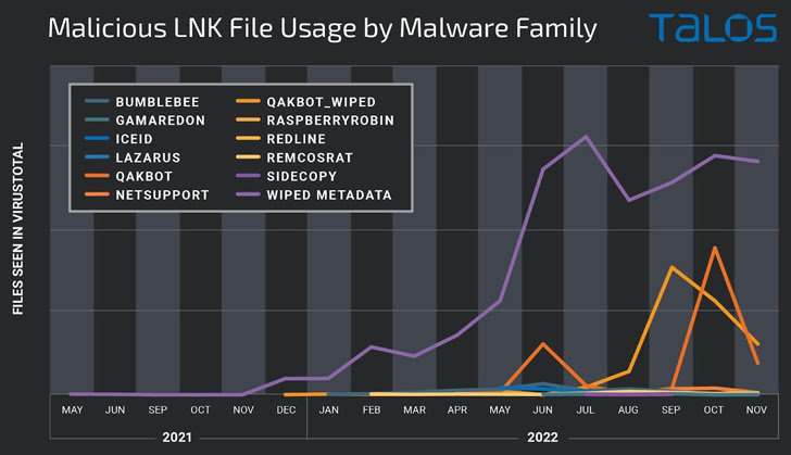 Some of the major malware families that have used LNK files for initial access include Bumblebee, IcedID, and Qakbot, with Talos identifying connections between Bumblebee and IcedID as well as Bumblebee and Qakbot by examining the artifacts’ metadata.