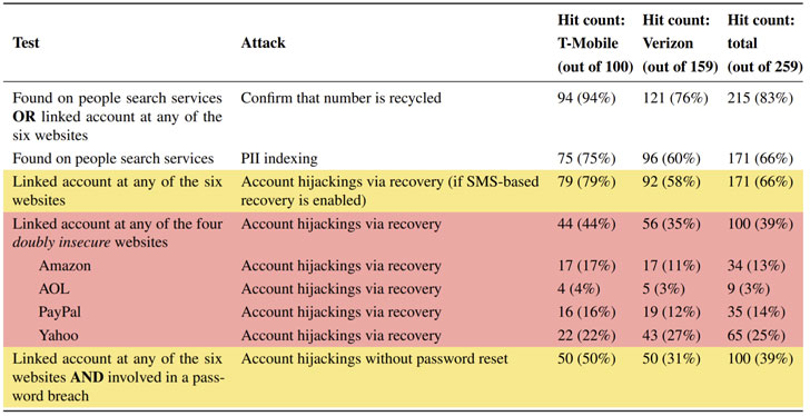 Nearly 66% of the recycled numbers that were sampled were found to be tied to previous owners’ online accounts at popular websites, potentially enabling account hijacks by simply recovering the accounts tied to those numbers.