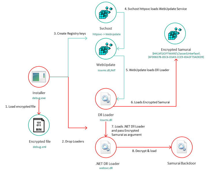The attack sequence post the deployment of the China Chopper web shell leads to the execution of a dropper that, in turn, is used to make Windows Registry modifications to launch a second-stage loader, which, for its part, is designed to trigger a third-stage .NET loader that’s responsible for running Samurai.