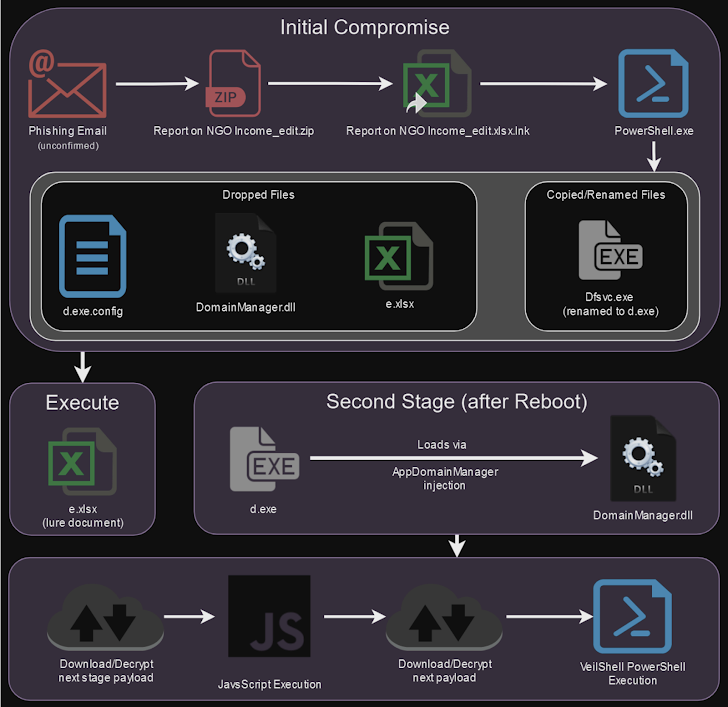 What makes the attack chain stand out is the use of a lesser-known technique called AppDomainManager injection in order to execute DomainManager.dll when “d.exe” is launched at startup and the binary reads the accompanying “d.exe.config” file located in the same startup folder.