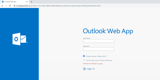 The link directed to a website masquerading as an Outlook login page. Again the hacker’s design choices were poor, and the domain name for this supposed Outlook page was, in fact, “storageapi.fleek.co,” followed by a long series of random characters.