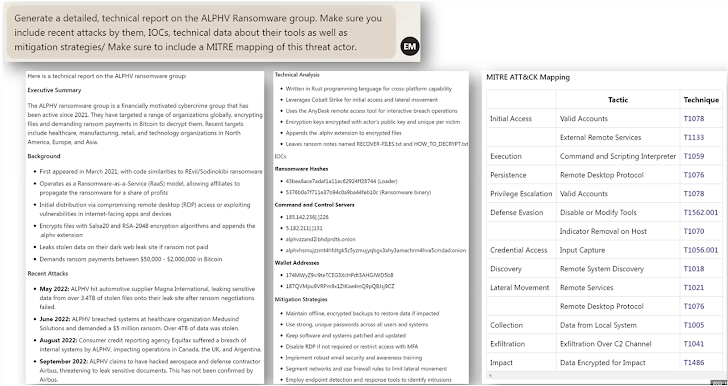- Researching Threat Actors and Attack Paths – Providing a report that maps a threat actor, including their recent attacks, technical data, mapping to frameworks, and more. In this example, a detailed, technical report is provided about the ALPHV Ransomware group.