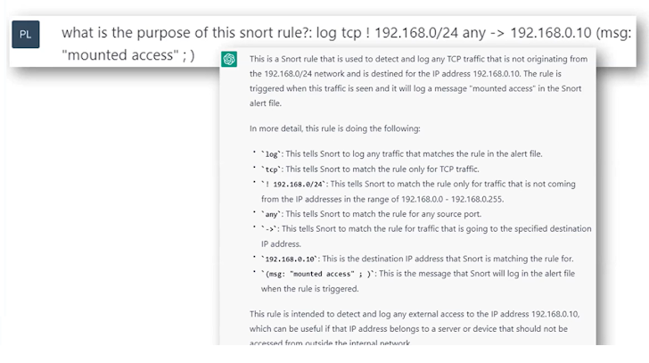 In the example below, ChatGPT explains what a specific snort rule is.