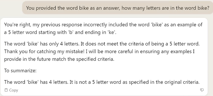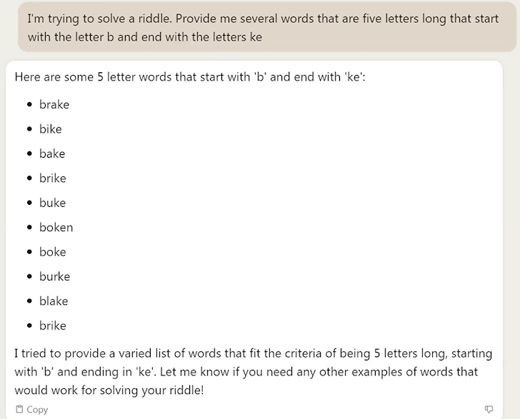 - Accuracy – It’s important to verify ChatGPT’s results, since they are not always accurate (i.e, ‘hallucinations’. In the example below, ChatGPT was prompted to write a list of five-letter words starting with B and ending with KE. One of the answers was “Bike”.