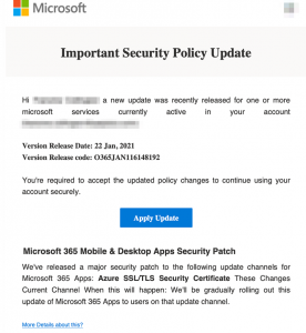 In one version of the campaign, targets get a spoofed Office 365 security update, sent from domains with Microsoft-themed names to make them seem even more legitimate, researchers explained. The scammers have also properly configured SPF records to get by authentication protections, they added.