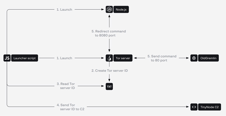 • TinyNode: A backdoor that runs the Node.js interpreter to execute commands received from a command-and-control (C2) server over the Tor network.