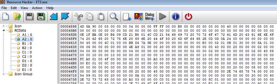 The ‘mess.exe’ is a loader for Poulight. It carries two more executable stored in ‘RCDATA’ resources. The names A1 and A2 in RCDATA contain .exe files and B1 and B2 contain the respective names of those executables.