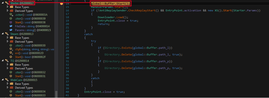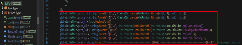 Then the malware creates two random folders in ‘C:Users<user>AppDataLocal<random-8-letters>’ which are used later. Also, the path of folders like Desktop, AppData, Local AppData, and Documents is stored in class variables.