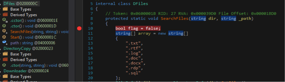 The DFiles class is interesting as it carries the extension list of sensitive documents to steal data.