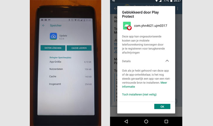 According to Malwarebytes, the Update app installs three different versions of a trojan (“Trojan.Downloader.Agent.WAGD”) that’s capable of sending SMS and WhatsApp messages, redirecting users to malicious game websites, and downloading additional malware-laced apps.