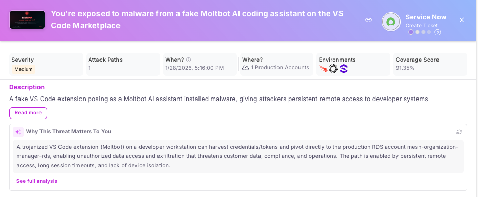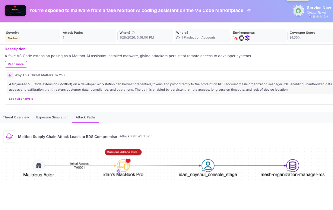 This is a live threat exposure. Not a breach, but an exploitable path that exists in your environment right now, invisible because no single tool can see all of it at once.