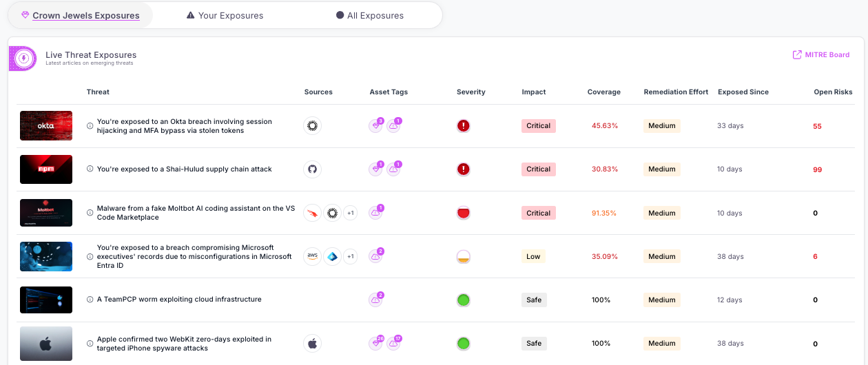 The platform correlates findings across domains – cloud posture misconfigurations, identity entitlement overreach, detection blind spots, unpatched vulnerabilities – and traces them forward against the Context Graph to determine which combinations create viable, multi-hop attack chains to Crown Jewels. Then, it prioritizes based on live threat intelligence.