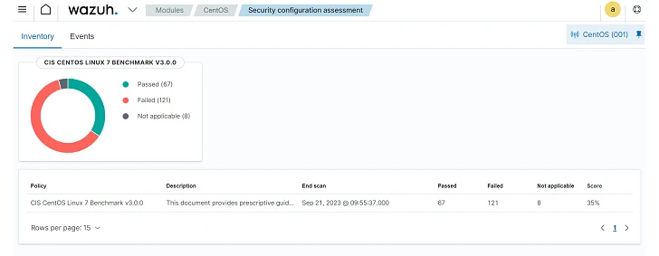 - Reporting – Wazuh generates detailed reports of checks performed on your endpoint. Wazuh SCA reports contain identified vulnerabilities, compliance gaps, and remediation actions to secure your endpoints. Also, the Wazuh dashboard has a Security configuration assessment module that allows you to view SCA scan results for each agent. You can take clear, actionable steps to ensure compliance, secure system configurations, and improve IT hygiene.
