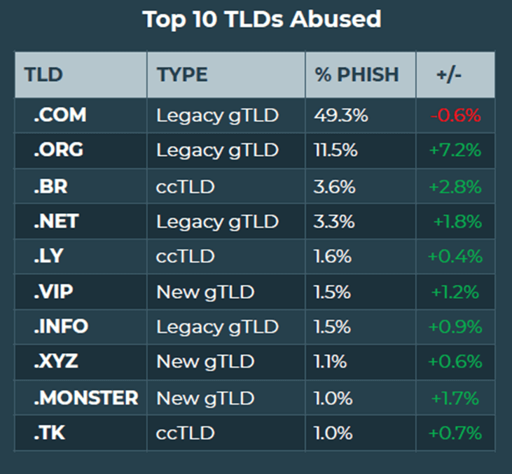 66% of phishing sites were staged on legacy generic Top-Level Domains (gTLDs), which contributed to almost half of all domain abuse phishing activity.  Of course, these dizzying numbers are more easily understood in the chart from the report.
